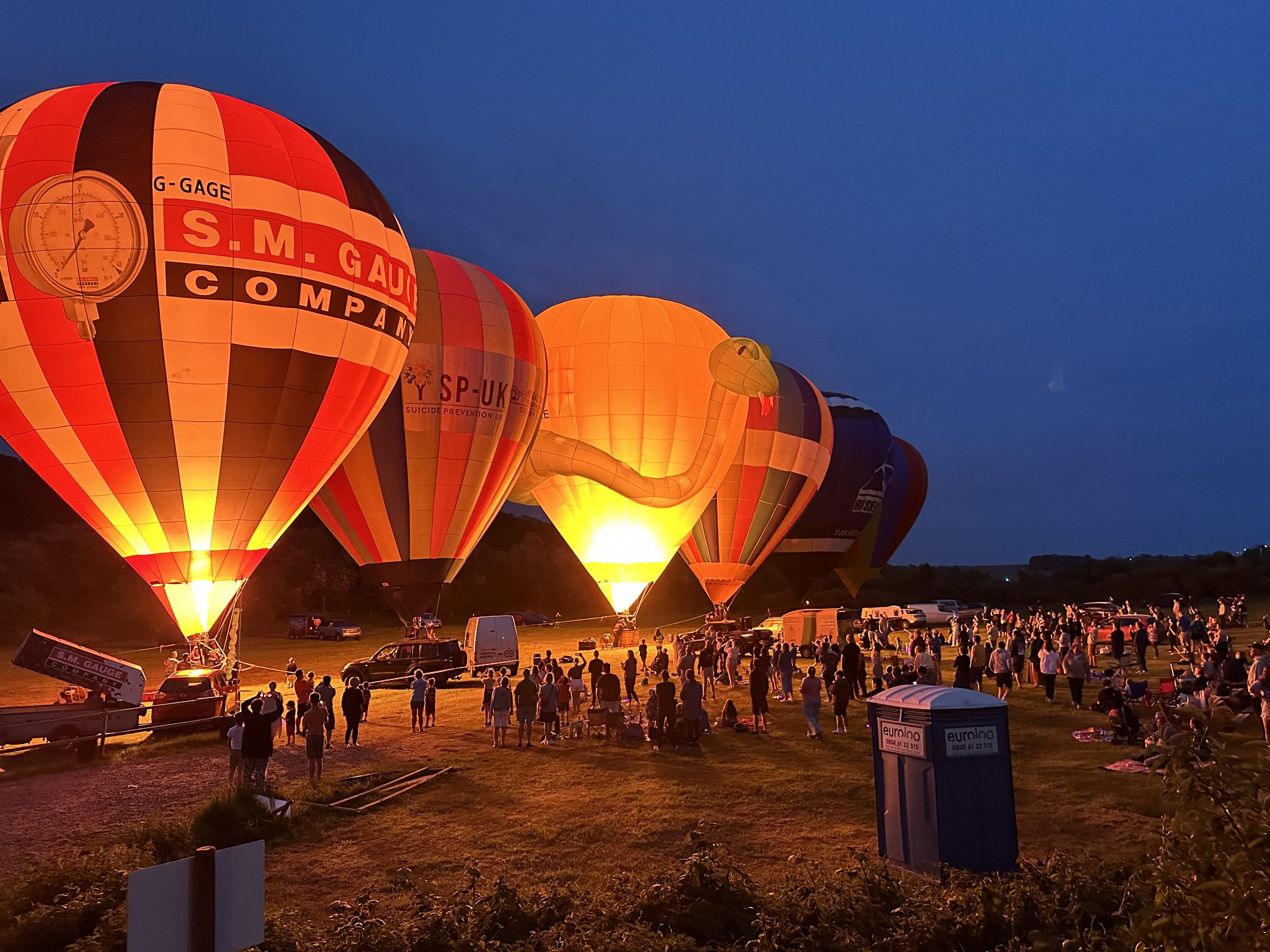 In May 2024, Bath Hot Air Balloon Club held our very own first balloon glow at Snake Meadows, featuring a stunning lineup of full-size hot air balloons and a few special-shaped balloons that added a unique touch to the event.