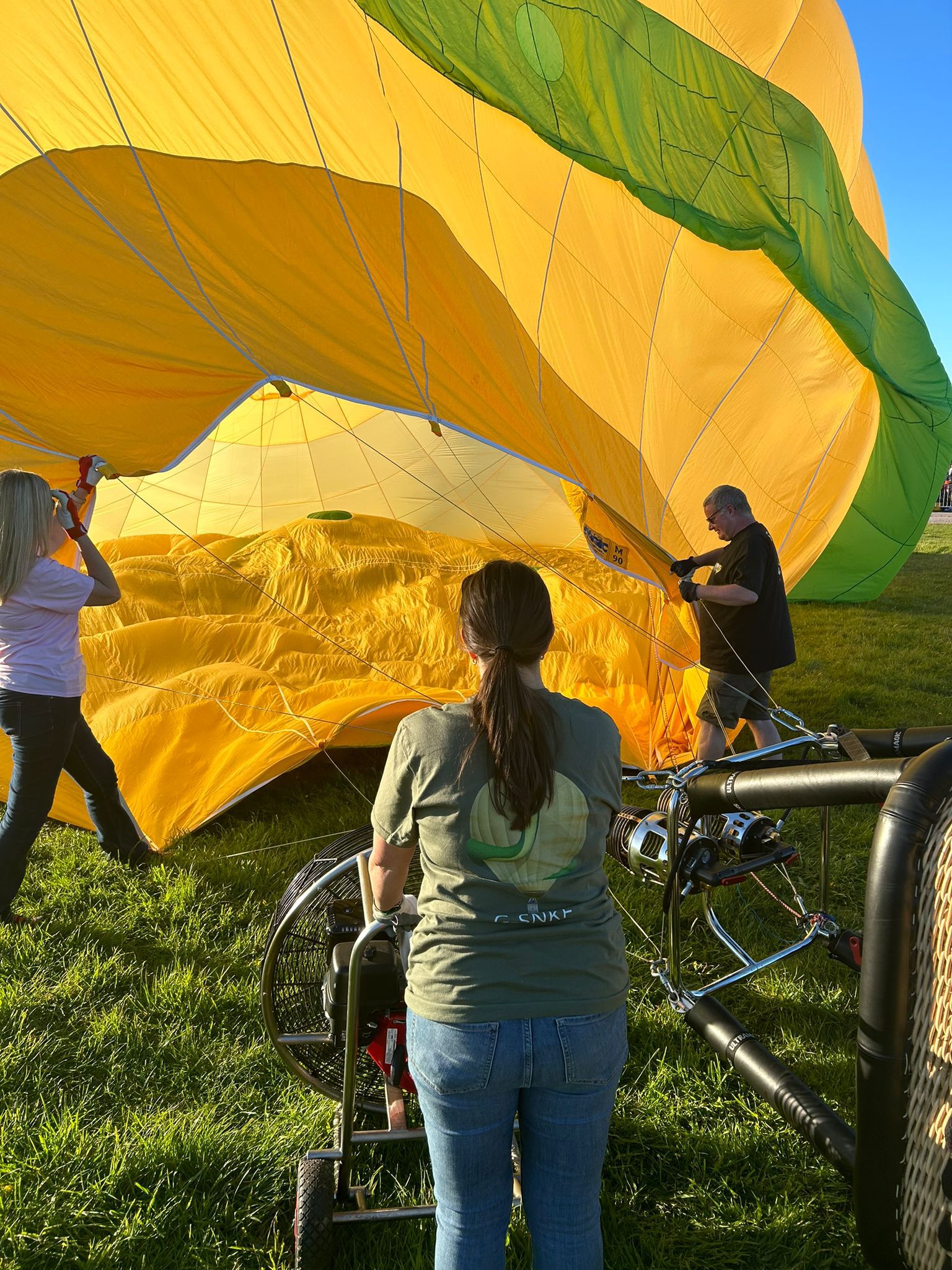 - The crew assists in inflating the balloon, using a fan to cold-inflate the envelope with air and then helping with the hot inflation by managing the burners.